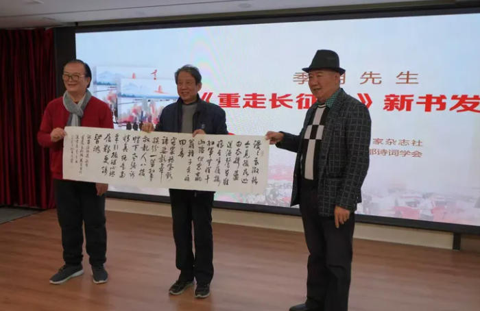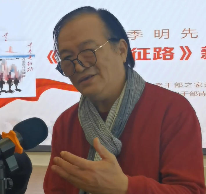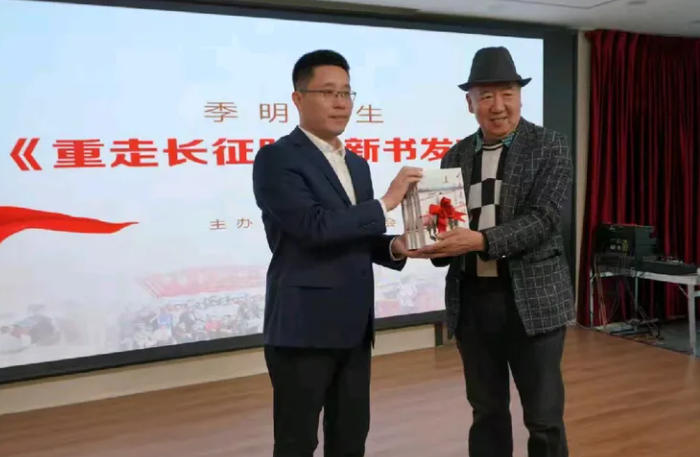 活动最后,主编季明发表答谢词。他抚摸书封,动情回忆21年前的场景,坦言这本书是“从时光深处打捞起的生命碎片”。他分享了一个感人瞬间:一位老红军在听诊时问医生是否听到了“红军的脚步声”,这让他深刻体会到“长征从未结束”。季明承诺,将把新书及现场收到的书画捐赠给长征纪念馆和大专院校,让长征精神成为可触摸的历史,鼓励更多人“续写新时代的长征”。他以一首《行香子·纪两次长征》作为结尾,高呼“伟大的长征精神万岁!”