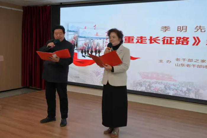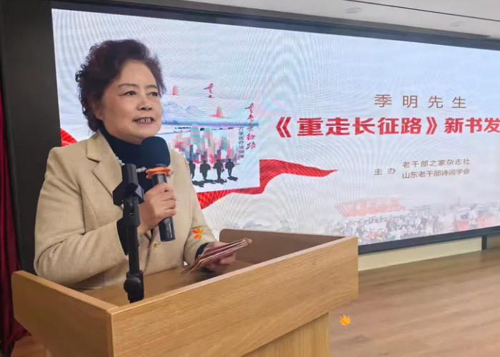 座谈会上,山东省老干部诗词学会会长任正在致辞中深情回顾了当年的壮举,并朗诵其创作的七律《读〈重走长征路〉书著有怀》,“莫道青丝成暮雪,长征星火再熊熊”的诗句,引发全场共鸣。他动情地说,这本书真实记录了志愿者们以“当年长征求解放,而今长征送健康”为宗旨,克服艰难险阻,为老区人民服务的感人事迹,展现了长征精神的星火传承。