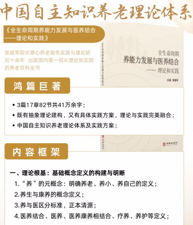 《全生命周期养能力发展与医养结合:理论和实践》摘要:全书共3篇17章82节,约41万字,它从全生命周期视角出发,深入剖析了养和医,并在此基础上构建出“中国老年学自主知识体系与实践规划”,涵盖以下三大板块,共18项核心内容: