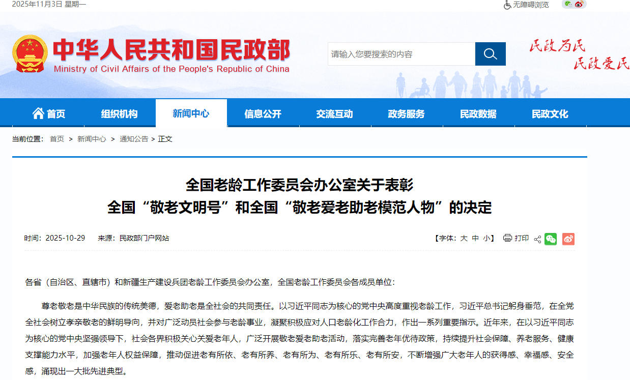 据悉,此次评选经逐级推荐、严格审核和公示,全国共授予1290个集体“敬老文明号”称号、1990名个人“敬老爱老助老模范人物”称号。(褚福星)