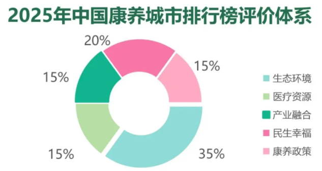 据悉,该排行榜构建了包含五大一级指标的康养城市评价体系,涵盖生态环境、医疗资源、产业融合、民生幸福和康养政策。其中,生态环境权重最高,占比35%,反映出在当前城市化进程中,空气质量、绿化水平、温度适宜度与水环境质量已成为衡量城市是否宜居的核心要素。