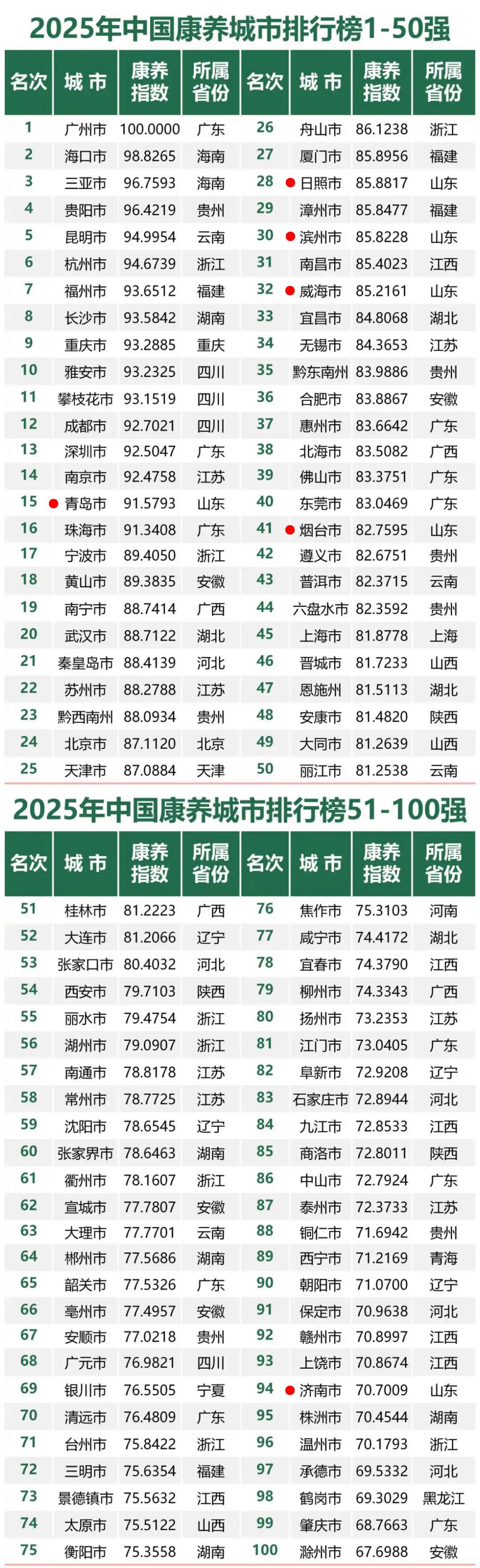 2025年康养城市百强榜发布:山东上榜城市增至6席,日照新晋入选