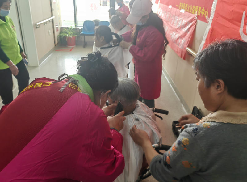 “精神了吧?”一位志愿者为理完发的老人轻抚肩头,镜中的老人笑容满面,仿佛年轻了几岁。另一位志愿者小心修剪着银发:“这边再去一点点……”手中的剪刀起落轻柔,动作一丝不苟。有老人打趣道:“买卖还不错!”引得满室欢笑。这些温馨场景,成为病房里独特的风景线。