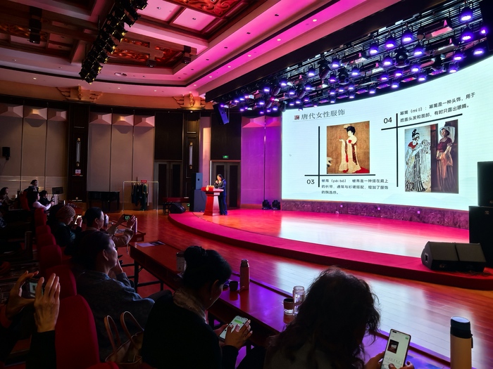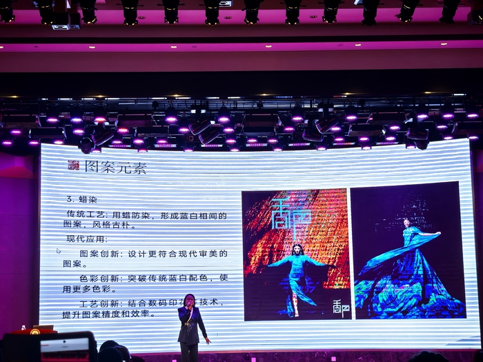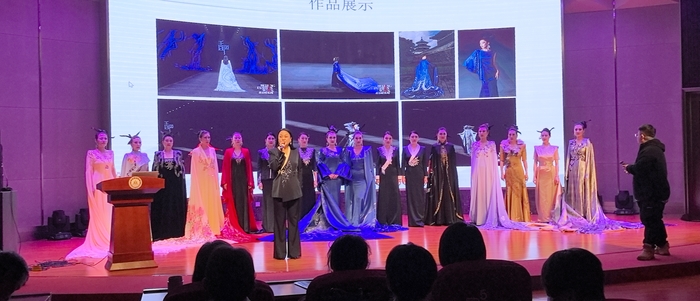 在课堂上,阎洁女士讲解了中国历朝历代的服饰特色,新中式服装中常用的云纹、回纹、方胜纹等图案的美好寓意,介绍了新中式服饰的起源以及中国传统色彩体系、色彩的搭配技巧。她还请走秀的学员身着她设计的华服上台,分析了服装图案、款式、面料、珠绣、蜡染等工艺的特点。
